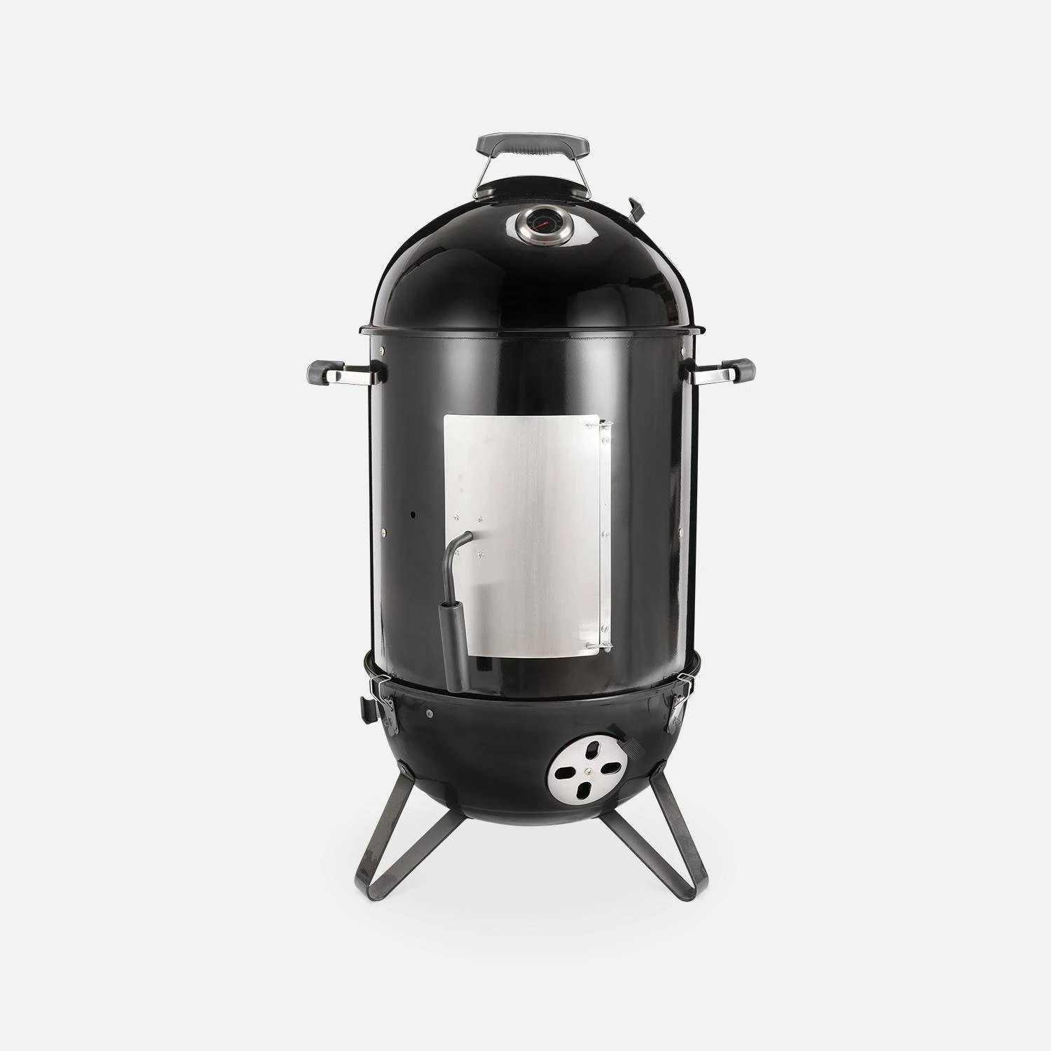 Le barbecue dispose d’une grande capacité de cuisson grâce à ses 2 grilles de cuisson et ses 3 crochets destinés au fumage vertical. De quoi cuisiner pour plusieurs personnes en même temps. Et pour ne pas décevoir vos convives, nous mettons tout en œuvre pour que vous puissiez maîtriser la cuisson comme un chef. Pour ce faire, le barbecue Jacques dispose d’un thermomètre et de 4 aérateurs : 1 sur le capot et 3 au niveau de la cuve. Pour obtenir une température basse, il suffit de fermer les clapets pour arrêter l’appel d’air et diminuer la présence d’oxygène. Au fur et à mesure de la cuisson, rechargez le charbon de bois et le liquide de fumage en ouvrant la porte latérale, soigneusement placée pour éviter la perte de fumée au maximum. Le capot et la chambre de fumage sont munis de poignées pour les manipuler aisément.