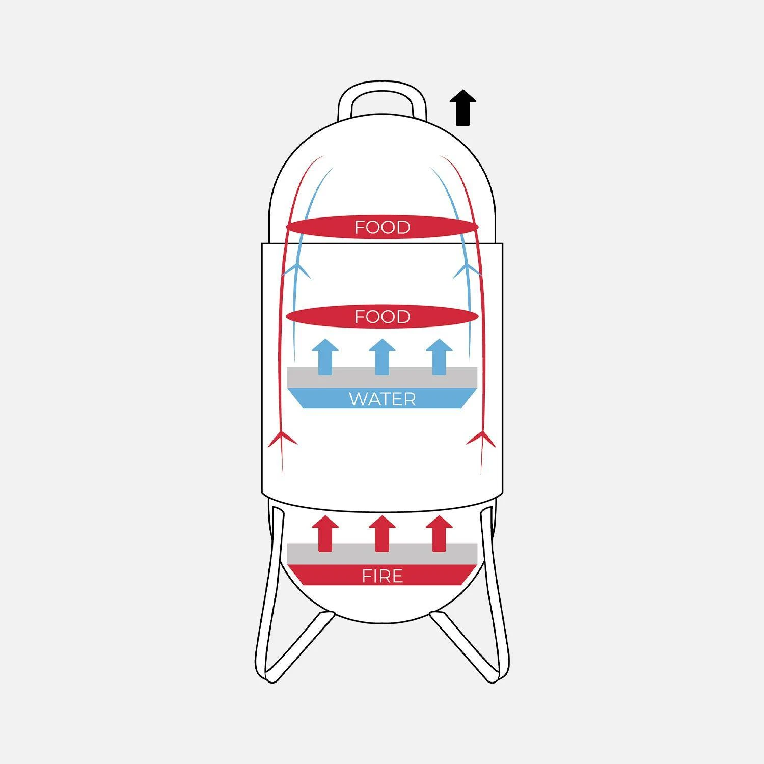 Le barbecue est composé de 3 parties : cuve à charbon (pour générer de la chaleur), compartiment de fumage et capot. Les 2 grilles de cuisson peuvent être utilisées simultanément ou de façon indépendante pour le fumage à plat. Pour un fumage vertical, il y a 3 crochets au niveau du capot afin de pendre les aliments. Si vous ne souhaitez pas fumer vos aliments, il est également possible d’utiliser le barbecue Jacques en barbecue traditionnel. Pou cela, retirez le récipient avec le liquide pour permettre à la chaleur d’entrer directement en contact avec les aliments.