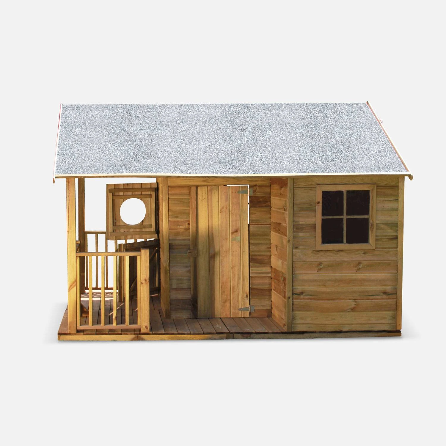 Avec cette maisonnette, les enfants peuvent profiter de deux espaces avec plancher : un espace intérieur et une belle véranda ouverte. Pour pénétrer à l’intérieur, ils ont le choix entre une porte sur le côté et une porte à l’avant de la maison en bois. L’intérieur est, d’ailleurs, très lumineux grâce aux deux fenêtres en plexiglas et au hublot placé sur la porte à double battants. La terrasse, quant à elle, est particulièrement appréciable lorsqu’il fait beau.