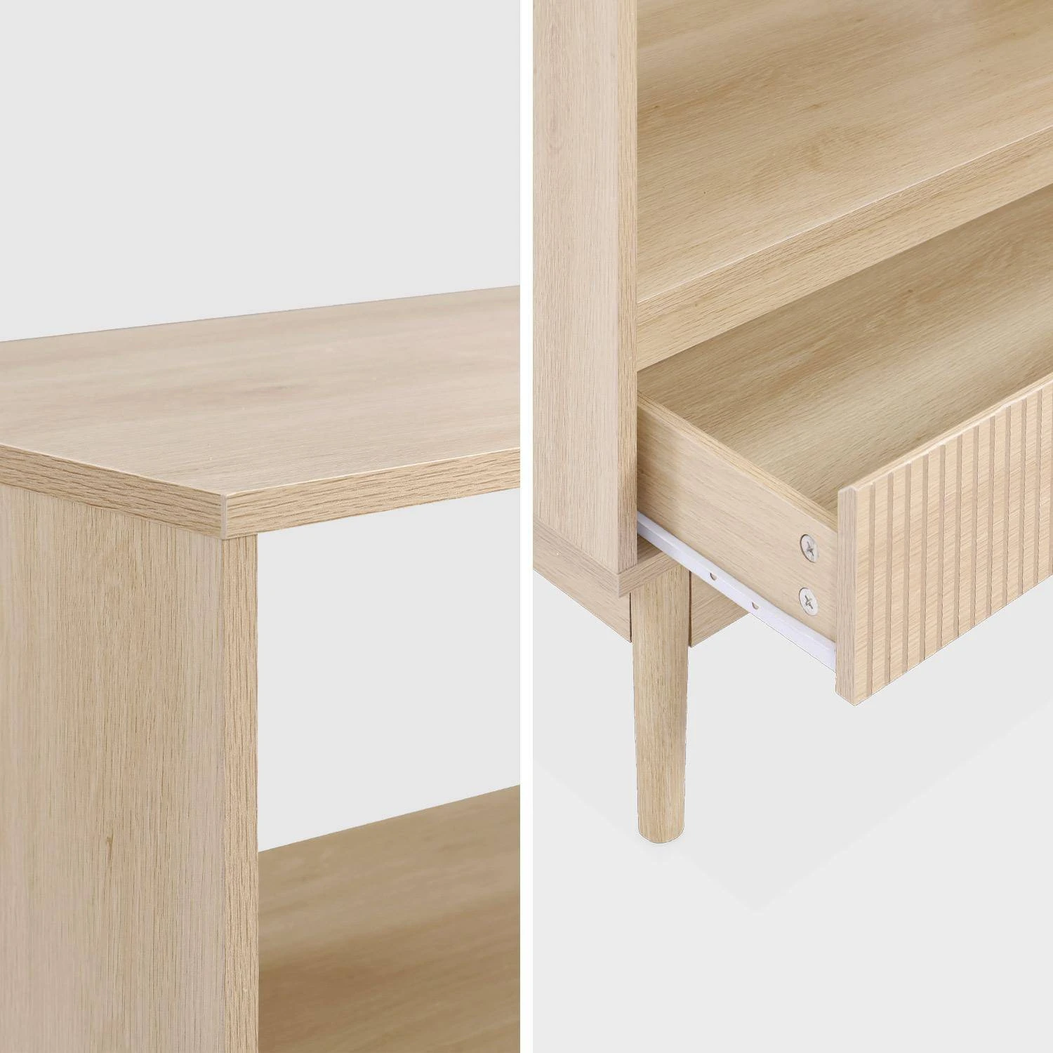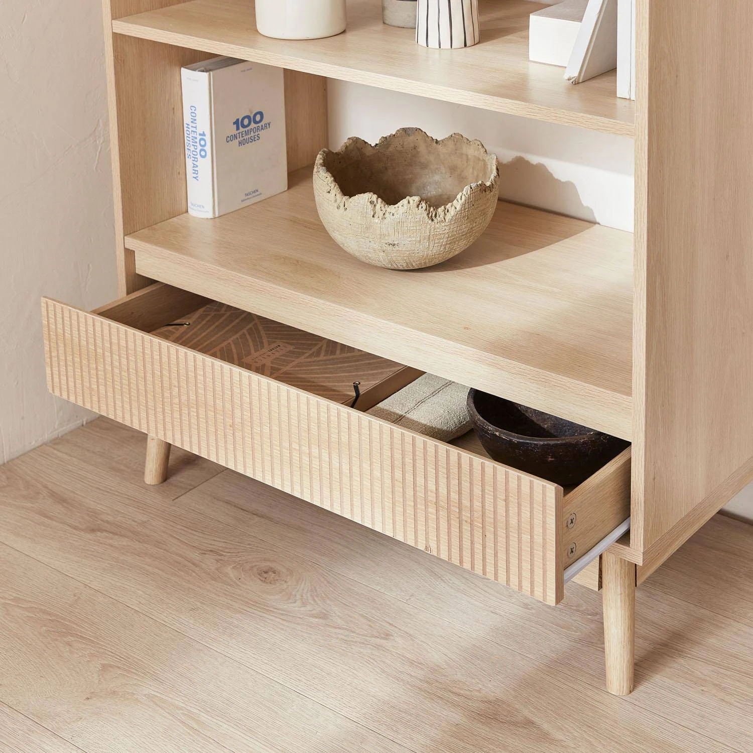 Les amateurs du style scandinave seront charmés par cette bibliothèque de la collection Linear. Avec sa structure en décor bois et son piètement compas en pin massif, elle se veut élégante et authentique. Le détail strié de son tiroir apporte une touche originale et minimaliste au tout. Cette étagère au design indémodable trouvera parfaitement sa place dans n’importe qu’elle pièce de votre maison.