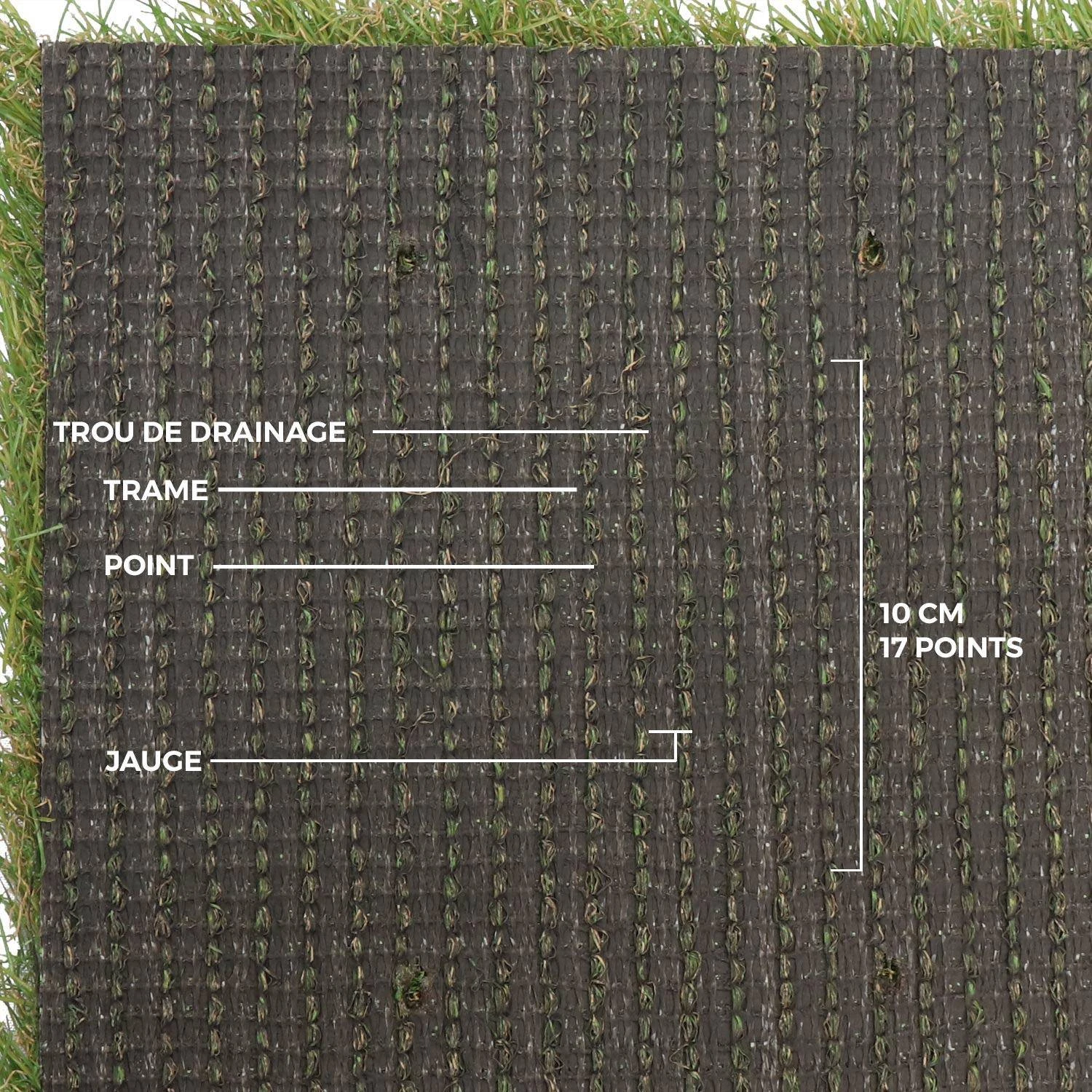 Idéal pour un usage extérieur, ce gazon synthétique est à la fois confortable au toucher et visuellement attrayant. Non seulement, il constitue une excellente bordure pour votre piscine, mais il peut également être utilisé pour embellir votre patio, votre balcon ou votre terrasse ! Son traitement anti-UV lui permet de résister facilement à l’usure, évitant ainsi toute perte de qualité au fil des années ! Par ailleurs, des trous de drainage sont présents tous les 10 cm pour une évacuation plus simple de l’eau !