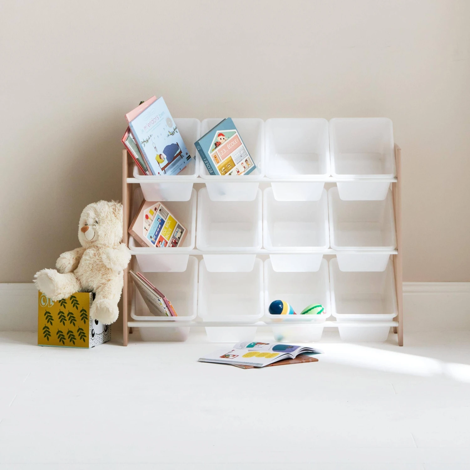 La chambre de votre enfant déborde de jouets et vous ne savez pas où les ranger ? Ce meuble de rangement Tobias est la solution idéale pour ranger les affaires de votre enfant. Les 12 casiers en plastique livrés avec le meuble peuvent accueillir livres, jouets, chaussures. Ils sont légers et peuvent être facilement manipulés par les enfants. Avec sa couleur douce, il a un design épuré qui participera à la décoration de la chambre de votre bambin. Enfin, il est doté de 2 poignées latérales pour pouvoir le bouger en toute facilité.