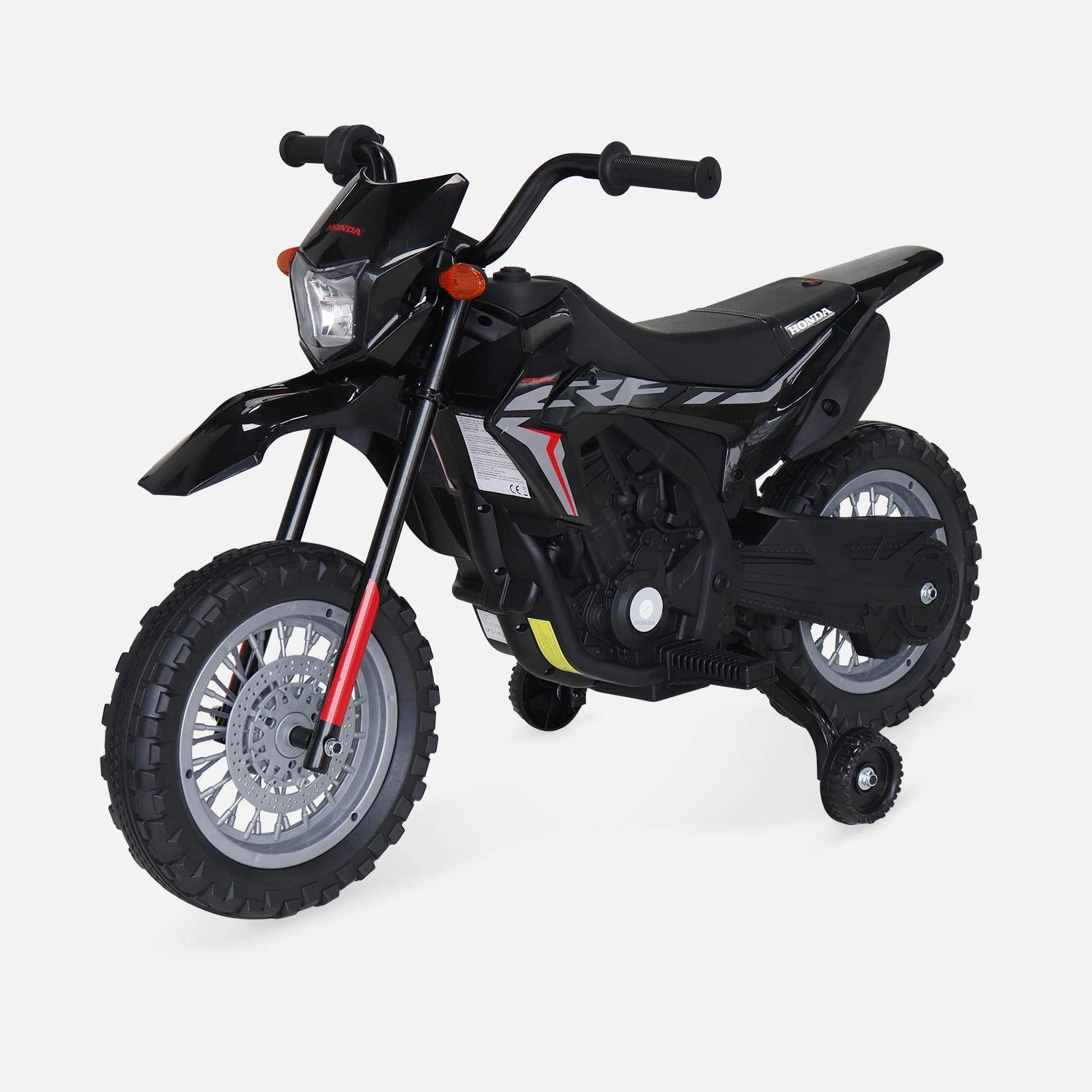 Réalisez le rêve de votre enfant en lui offrant cette moto électrique Honda 6V. Il va adorer faire comme les vrais pilotes : démarrer le moteur, allumer les phares et enfoncer la pédale d’accélérateur. Pas d’inquiétude pour les parents, la moto ralentit et s’arrête automatiquement quand la pédale d’accélération est relachée. Un interrupteur permet passer de la marche avant à la marche arrière.